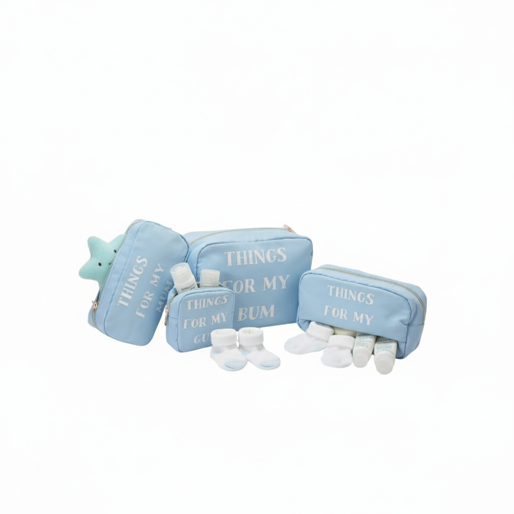 💙 Stay organised, look good, and parent like a pro with this charming four piece Pouch bundle. Makes a thoughtful baby shower gift or a stylish start to your parenting journey.
