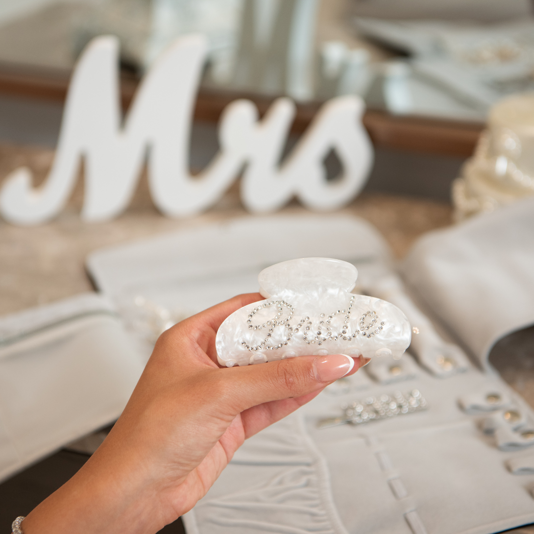 Our “Bride” Hair Clip — a timeless accessory designed to make the bride shine.