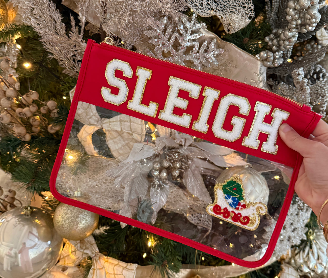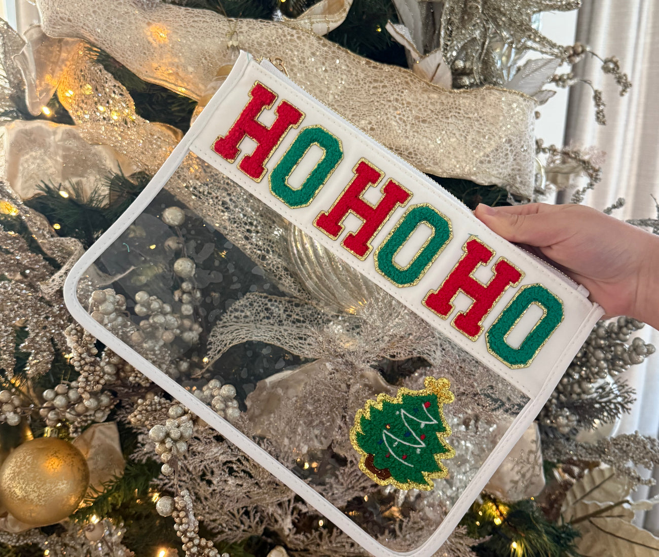 Our HO HO HO Christmas Clear Pouch is a bright and cheerful seasonal piece, designed with a white trim, classic red and green lettering, and a textured Christmas tree patch. The clear body keeps it practical, easy to clean, and perfect for everyday organisation during the holidays.