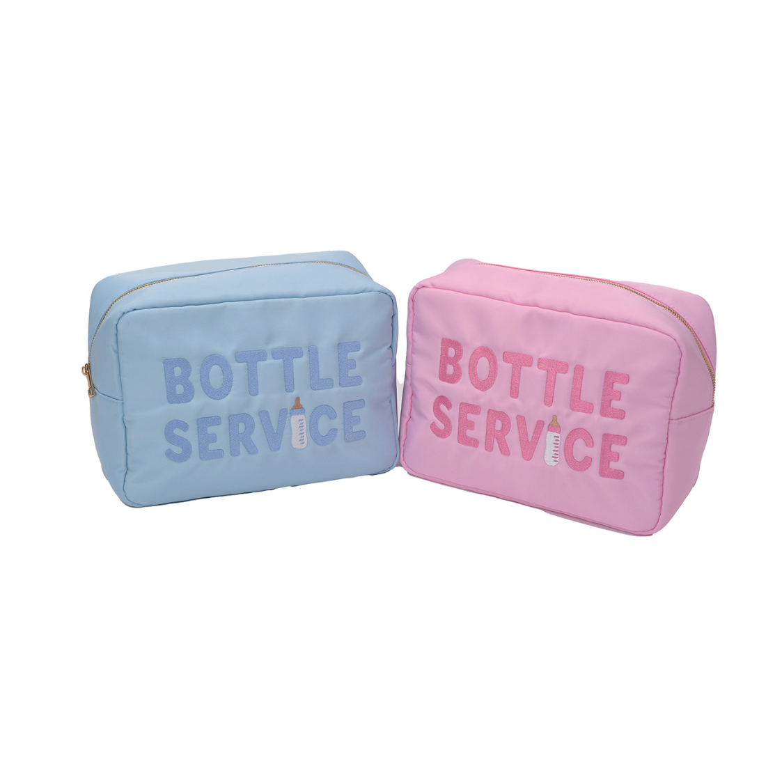 Whether it’s baby bottles, beauty products, or bubbly on the go, our Large Baby Pink “Bottle Service” Pouch is designed to handle it all with a wink. Featuring a fun chenille patch and ample room inside, this pouch is your stylish solution for staying organised, no matter the occasion.