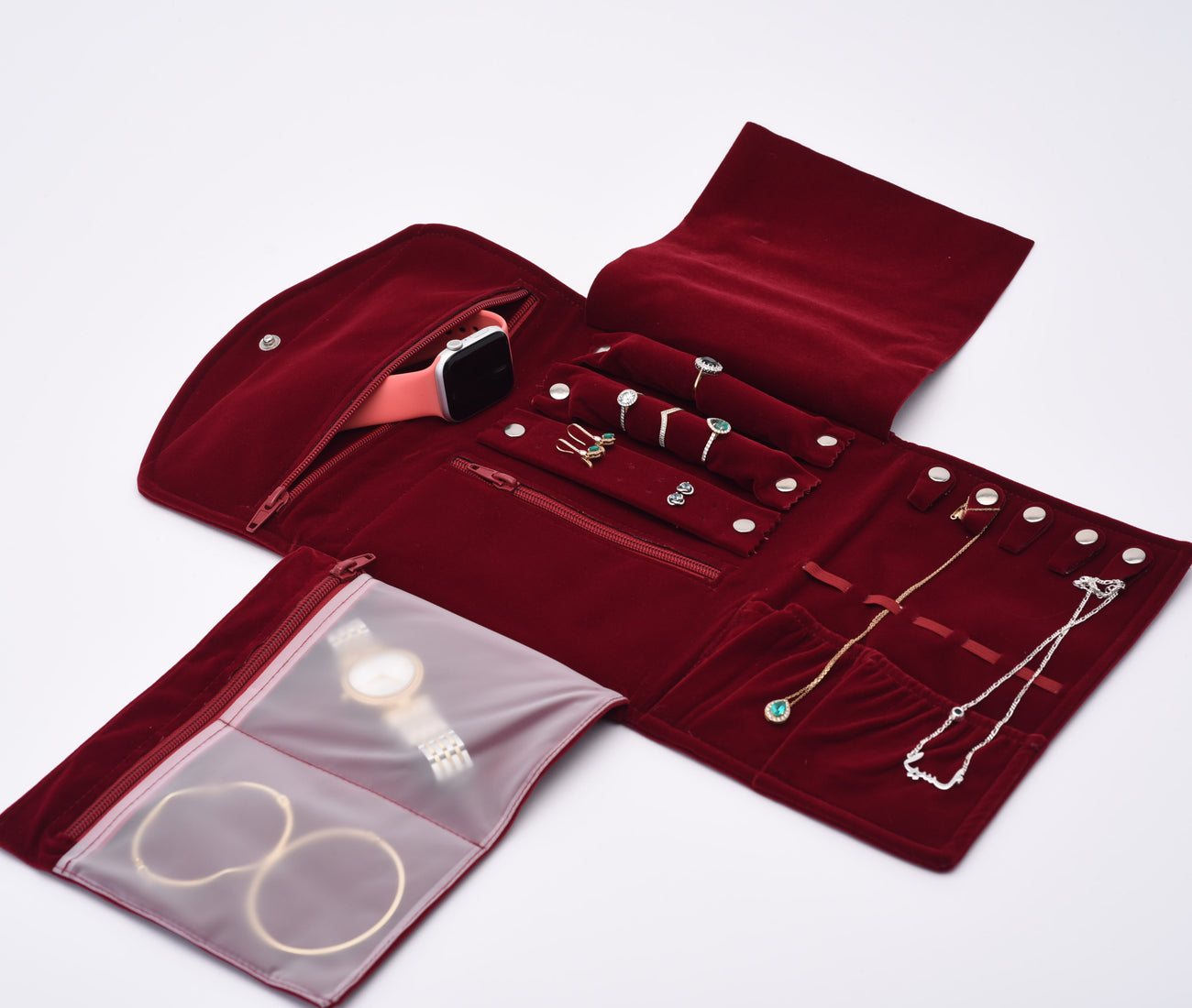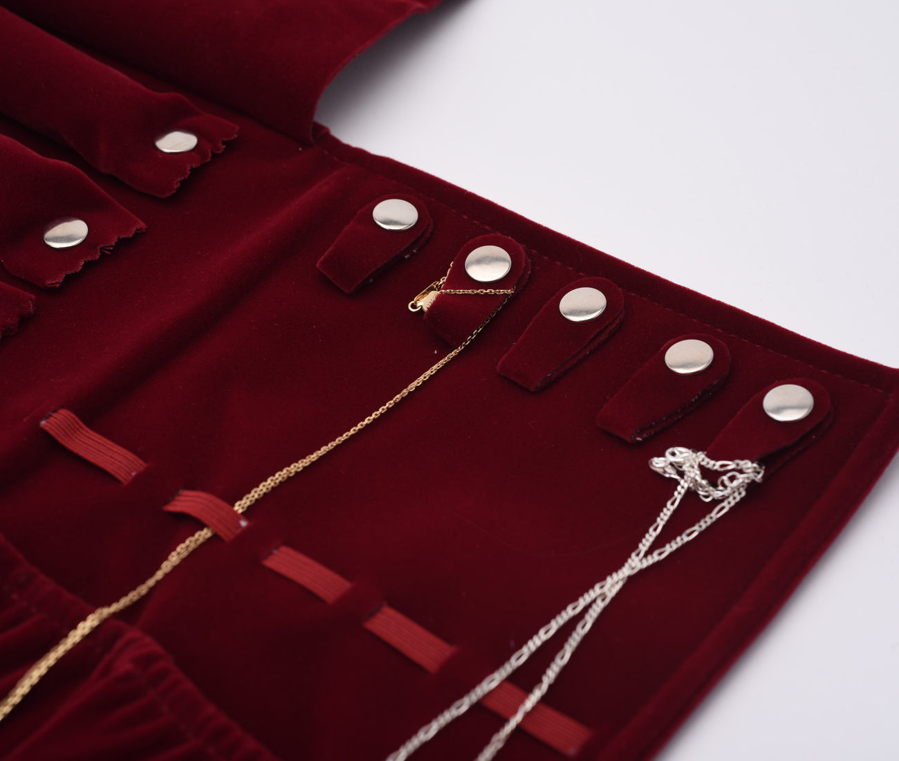 This roll-up case is both compact and practical, making it the perfect organiser for rings, necklaces, earrings, and keepsakes. The interior features soft, protective lining and multiple compartments to keep your pieces secure, untangled, and scratch-free.