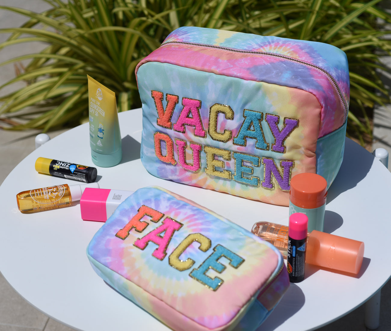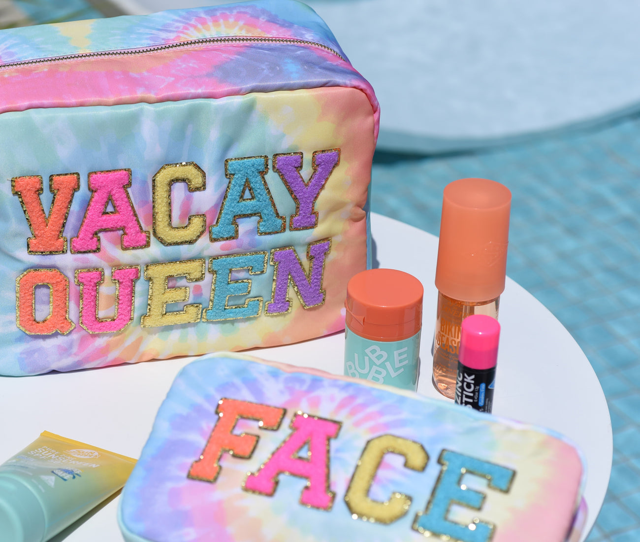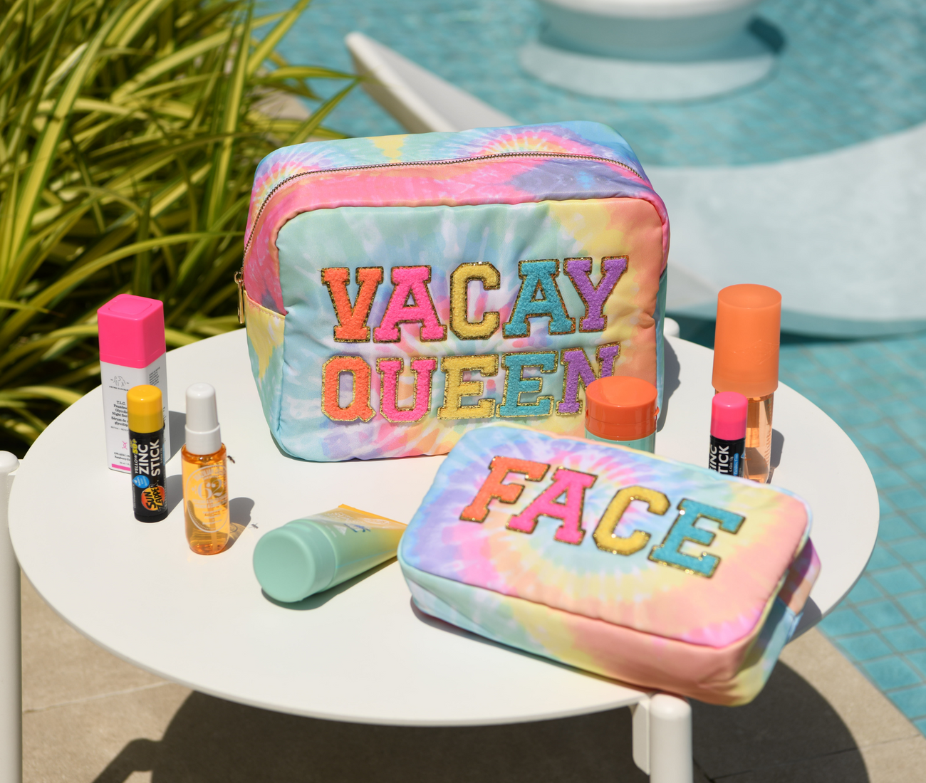 “Vacay Queen” Large Pouch – spacious enough for your makeup, skincare, and beach-day essentials.