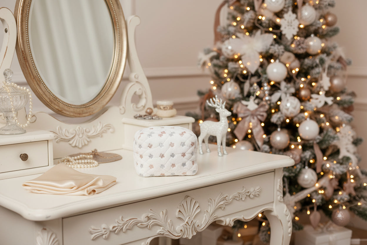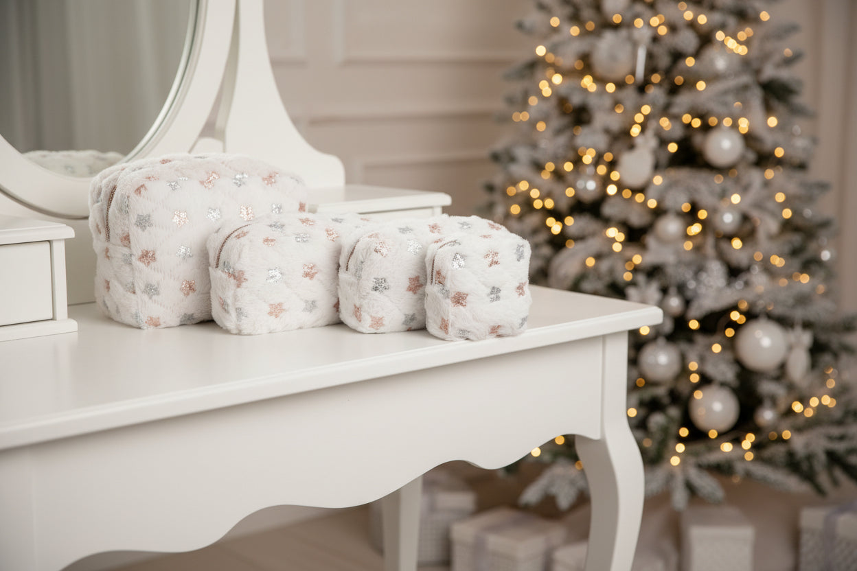 Wrap your holiday season in cosy luxury with this dreamy White Faux Fur Pouch Bundle, embroidered with delicate rose gold and silver sequin stars. This set includes four sizes, from extra small to large, making it the ultimate gift (or self gift) for anyone who loves thoughtful storage with a touch of festive flair.